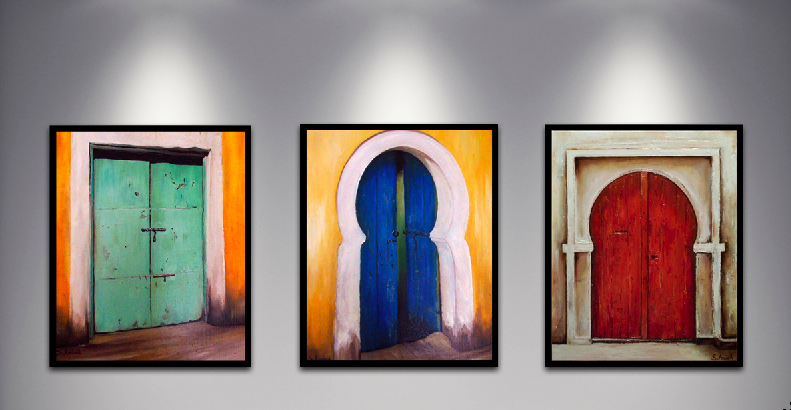Sur la toile, trois portes marocaines se dévoilent — verte en métal, bleue et rouge en bois aux encadrements arrondis — chacune ouvrant sur un monde secret, un écho discret aux jardins cachés de la médina, mêlant couleur, lumière et mystère.