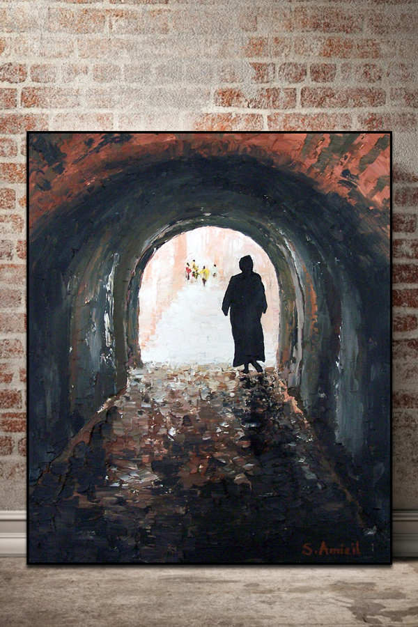 La Médina s’éveille sur la toile sous un passage voûté, où un personnage glisse de l’ombre à la lumière pour déboucher dans une ruelle vibrante, où les enfants jouent et rient, emplissant l’air de vie et de couleurs.