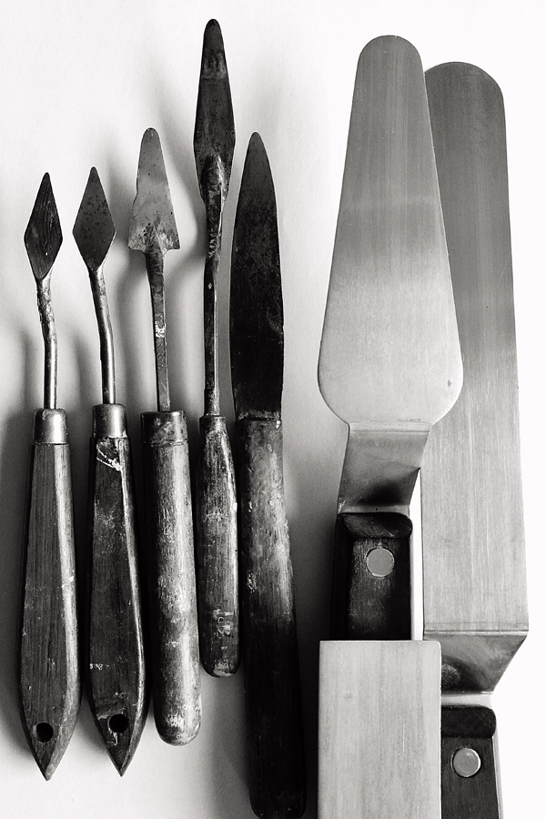 Cet équilibre entre la maîtrise des couleurs et la densité de la matière est atteint grâce à des outils de construction : la truelle, le couteau, la règle, l’équerre et le rapporteur.