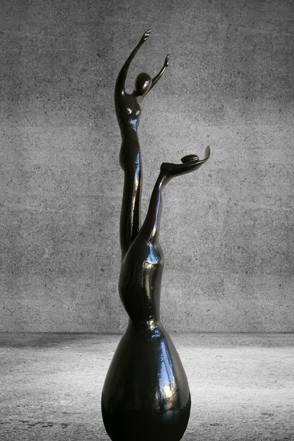 Cette sculpture sur bois est une tentative de saisir l’essence d’une passion romanesque. L’artiste concentre son intention sur la dynamique relationnelle caractérisée par un amour absolu qui implique une soumission totale. Le volume et la forme choisis traduisent cette tension entre la force de la passion et l’abandon de soi, transformant le bois, un matériau statique, en un réceptacle de la charge dramatique.