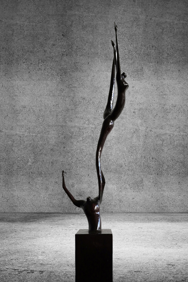 En tant que sculpteur, Amieil utilise le medium pour figer un instant d’harmonie et de défi physique, démontrant une fois de plus la maîtrise de la taille directe sur bois.